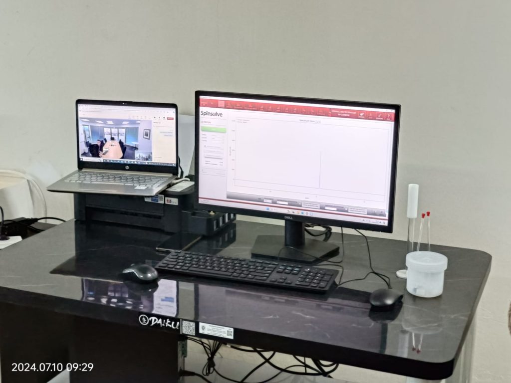 Pelatihan dilakukan secara Hybrid Online dan Offline dari New Zealand dengan Narasumber presentasi dari Magritek (Mr Finlay Burke) mengenai pengetahuan dasar dan mengoperasikan peralatan Benchtop NMR melalui tool Team Viewer.